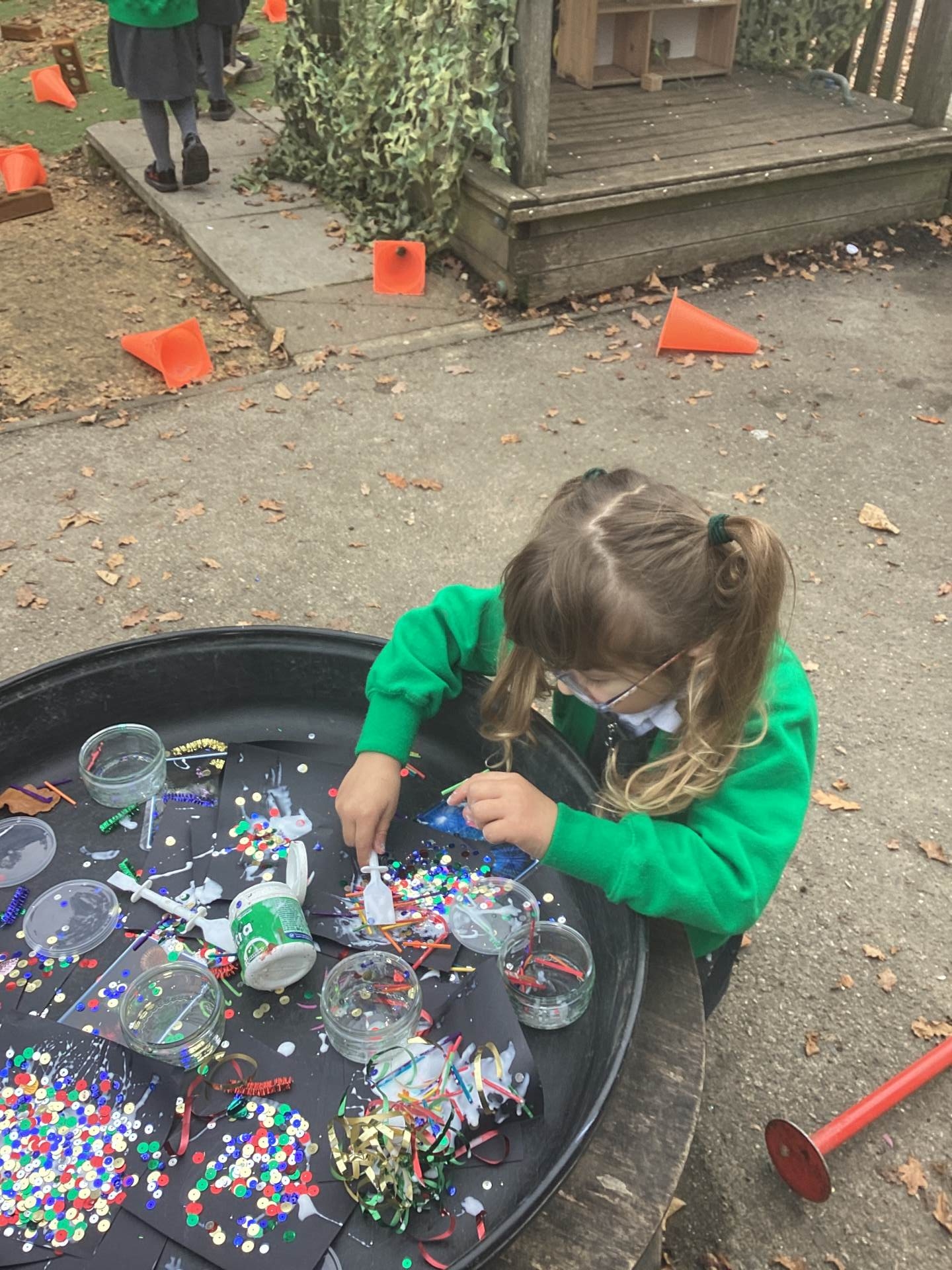 We did lots of firework themed activities this week including: making firework art, drawing marks in loose tea and rice to look like fireworks in a night sky, supporting us with our early mark making. We used scratch paper and stencils to make firework patterns, had a firework playdough station and even had fun getting messy with shaving foam and bubble wrap to replicate some of the noises that fireworks make - snap, crackle, bang!