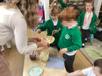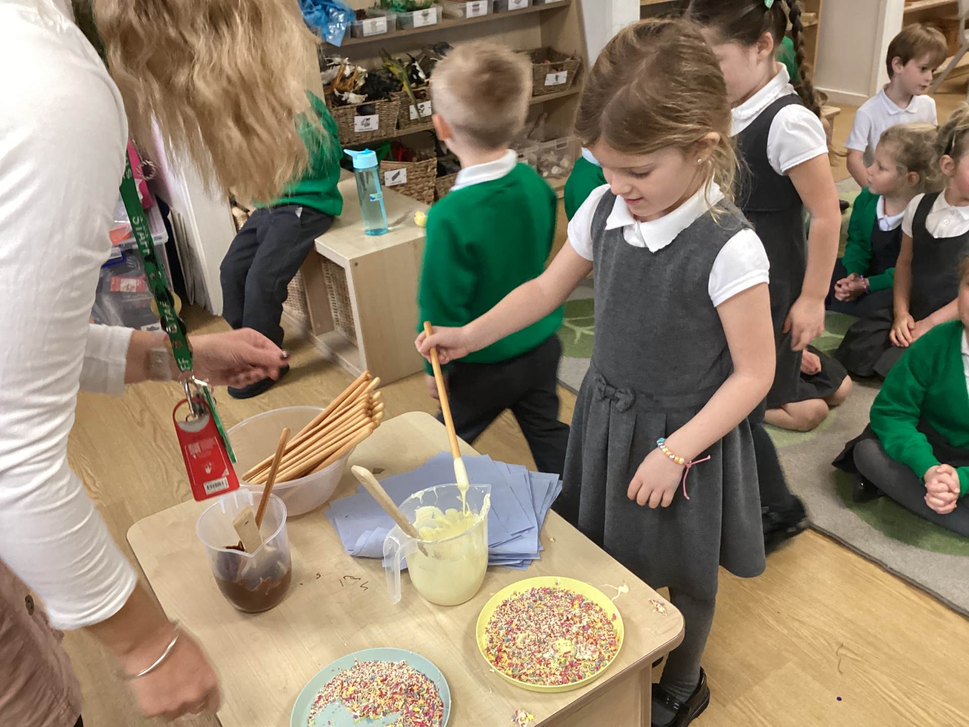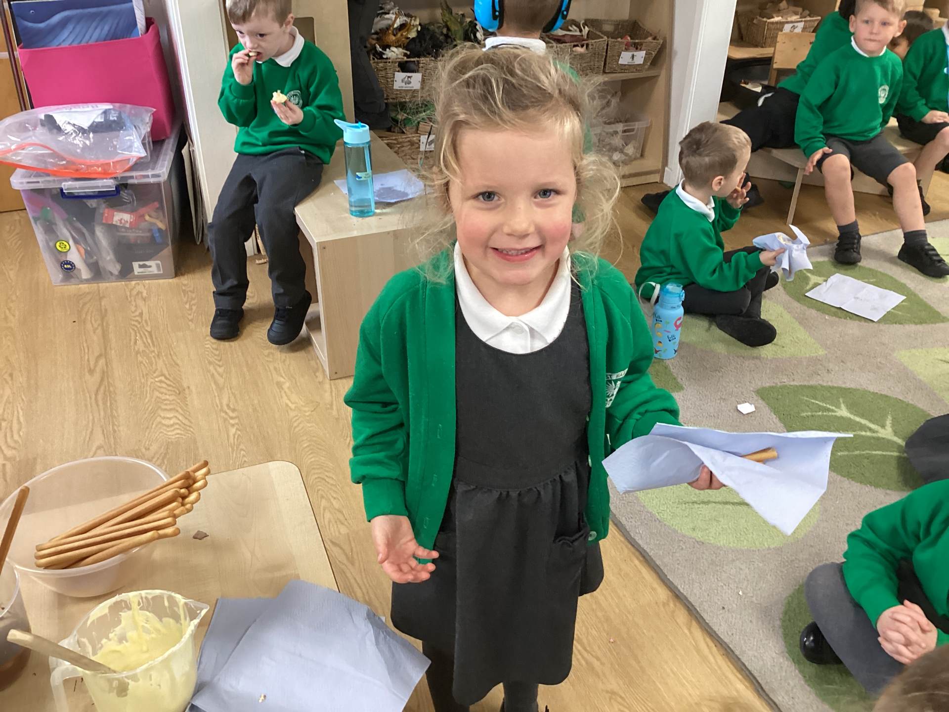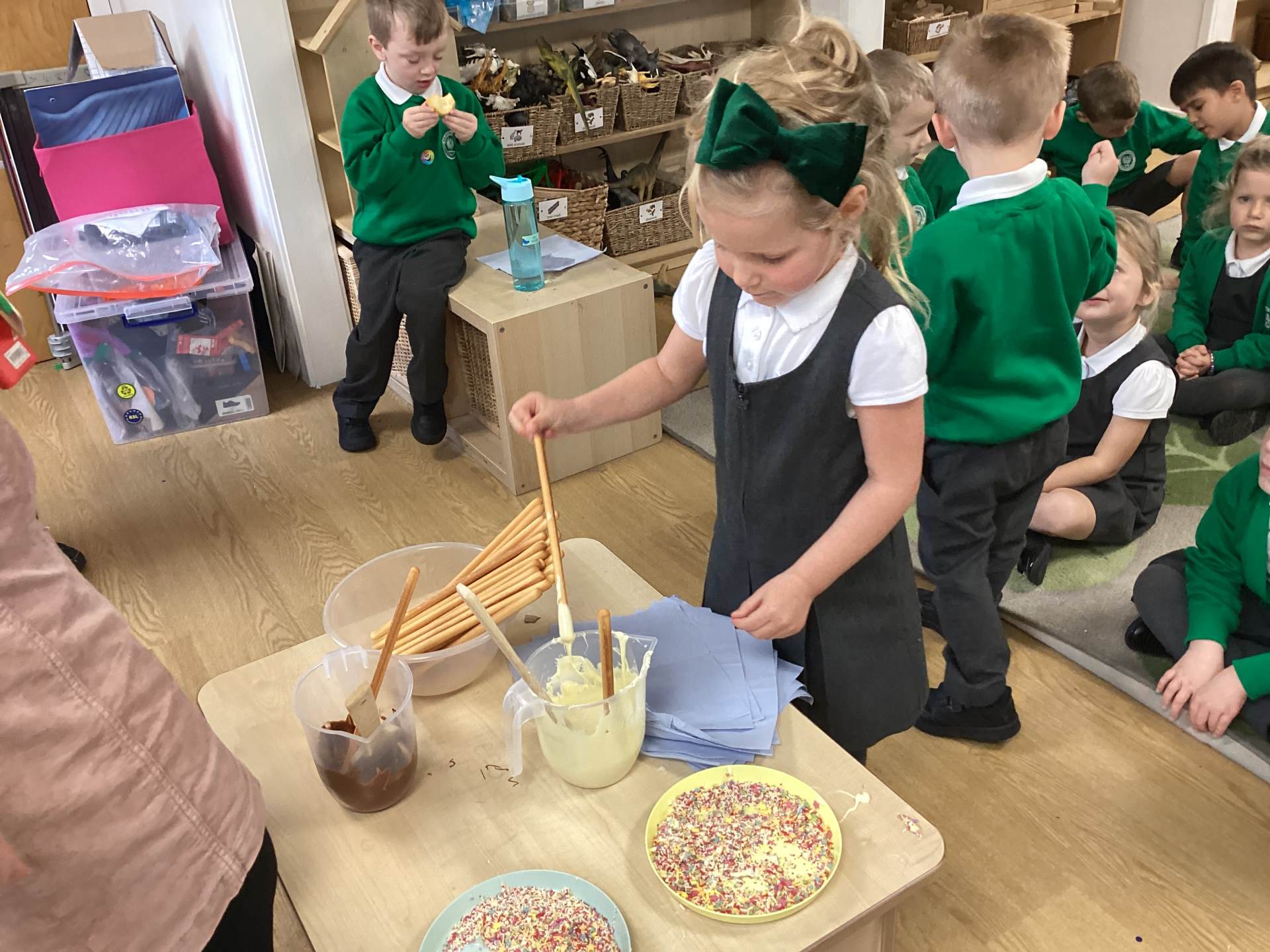 One day this week the children had a very exciting, treat snack of Sparkler Breadsticks! Please find the recipe below: