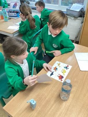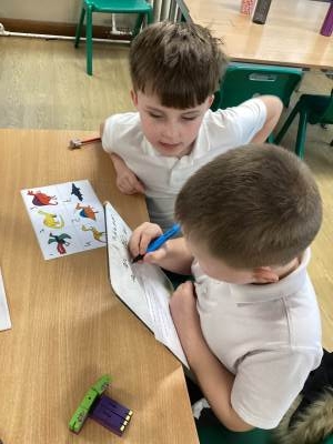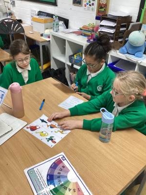 We started by looking at different attributes and characteristics of people and some very funny cartoon dinosaurs. We had to think carefully about what made each one different. Did the dinosaur have horns? Was it tall? Did the person have a hat? These details helped us decide what questions we could ask.