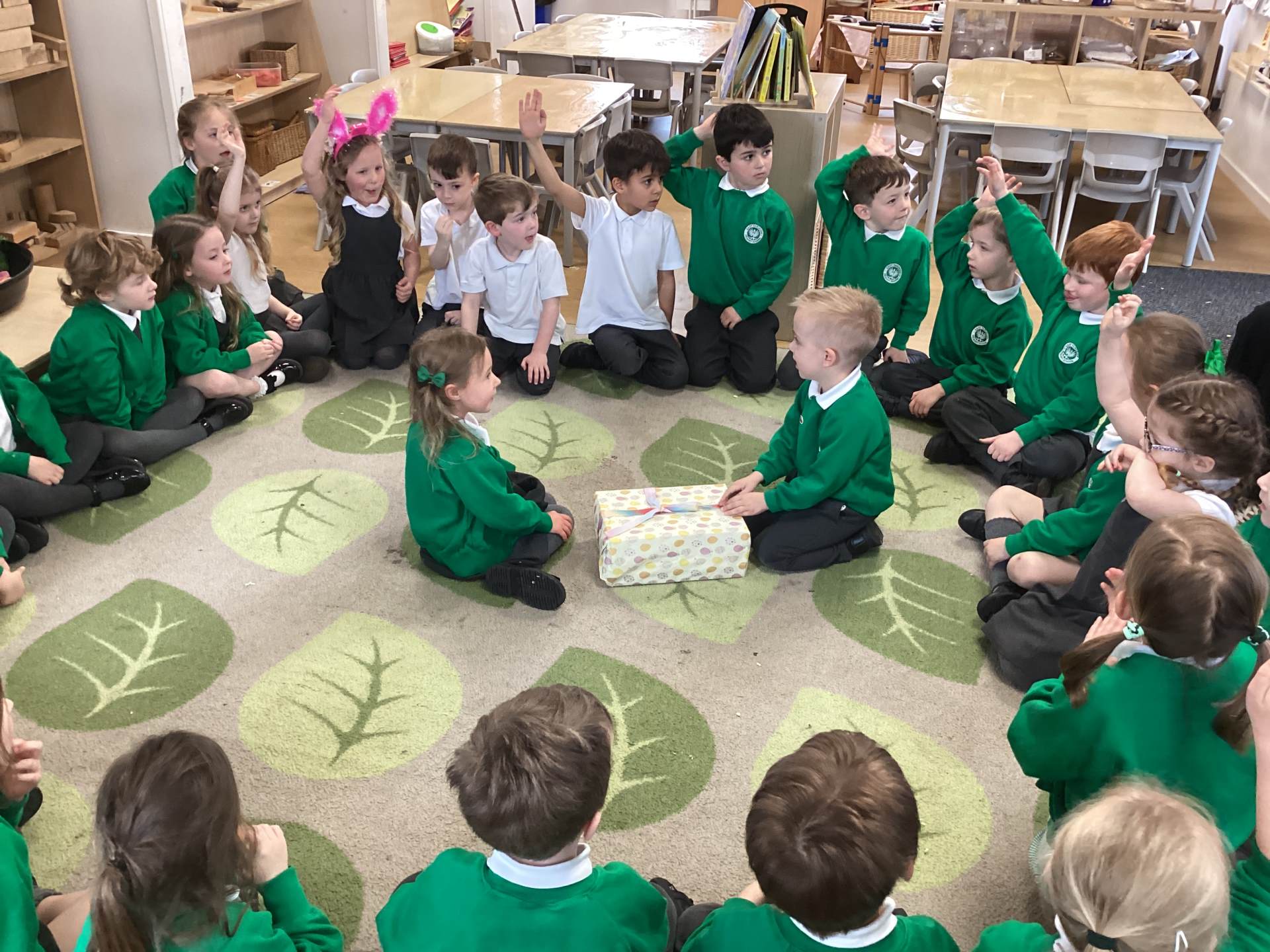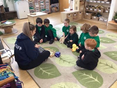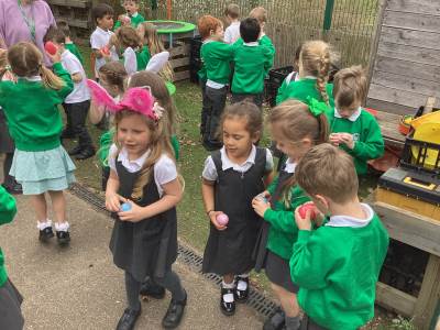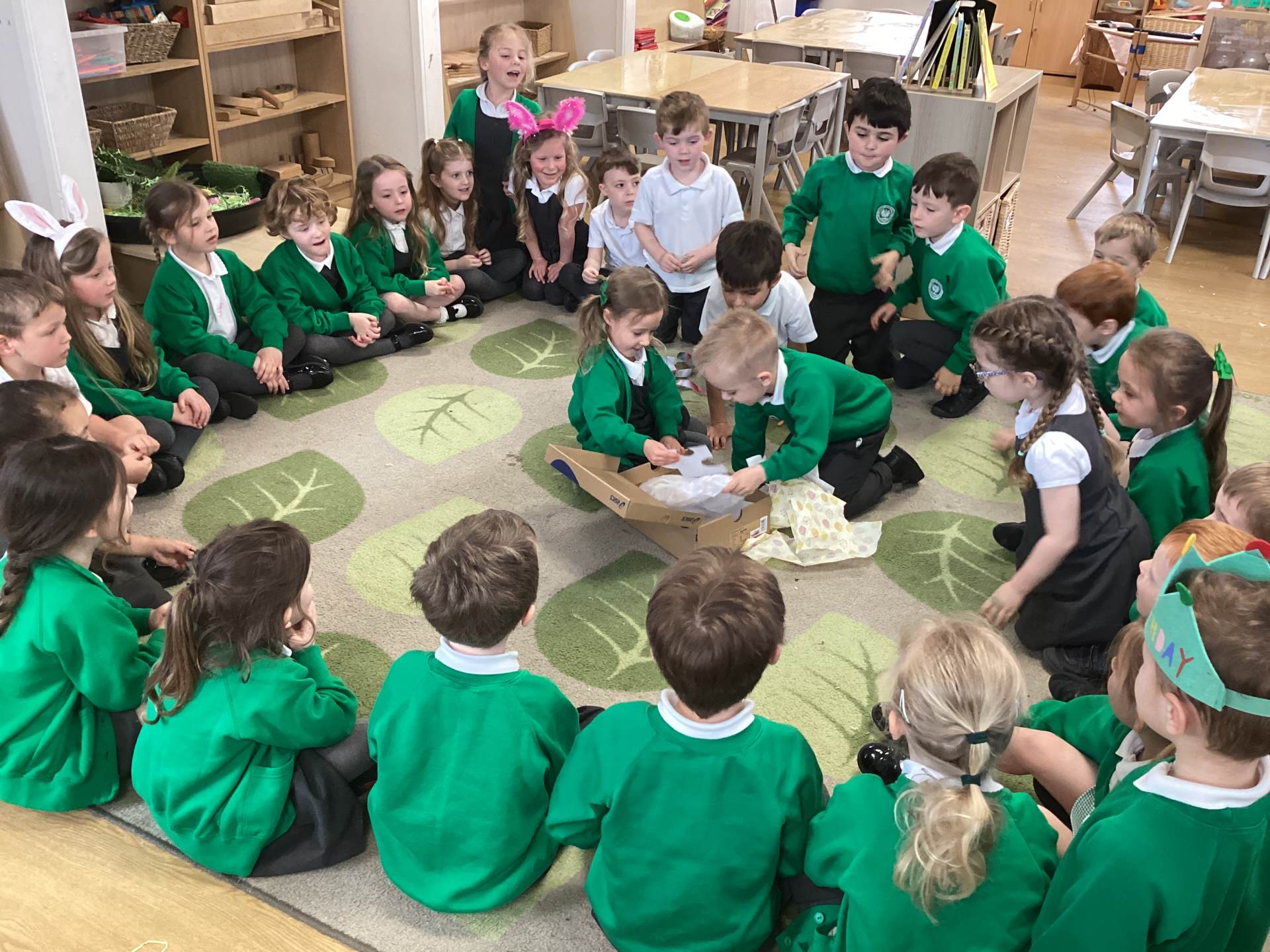 One of the most exciting moments of the week happened when we returned from PE on Monday to discover a beautiful gift and a letter waiting for us in the classroom—it had been left by the Easter Bunny! The letter asked the children to write back with their guesses about what might be inside the mysterious gift, and this became a focus for our writing throughout the week. The excitement built each day until Thursday, when we finally opened it together. To our surprise, no one had guessed correctly! Inside was a puzzle, which we worked together to complete, revealing the message: “It’s time for an egg hunt!” We rushed out into the garden where plastic eggs were hidden all around. The children helped one another to find an egg each and were delighted to enjoy a special Easter treat with their snack. It was such a magical and memorable surprise from the Easter Bunny!
