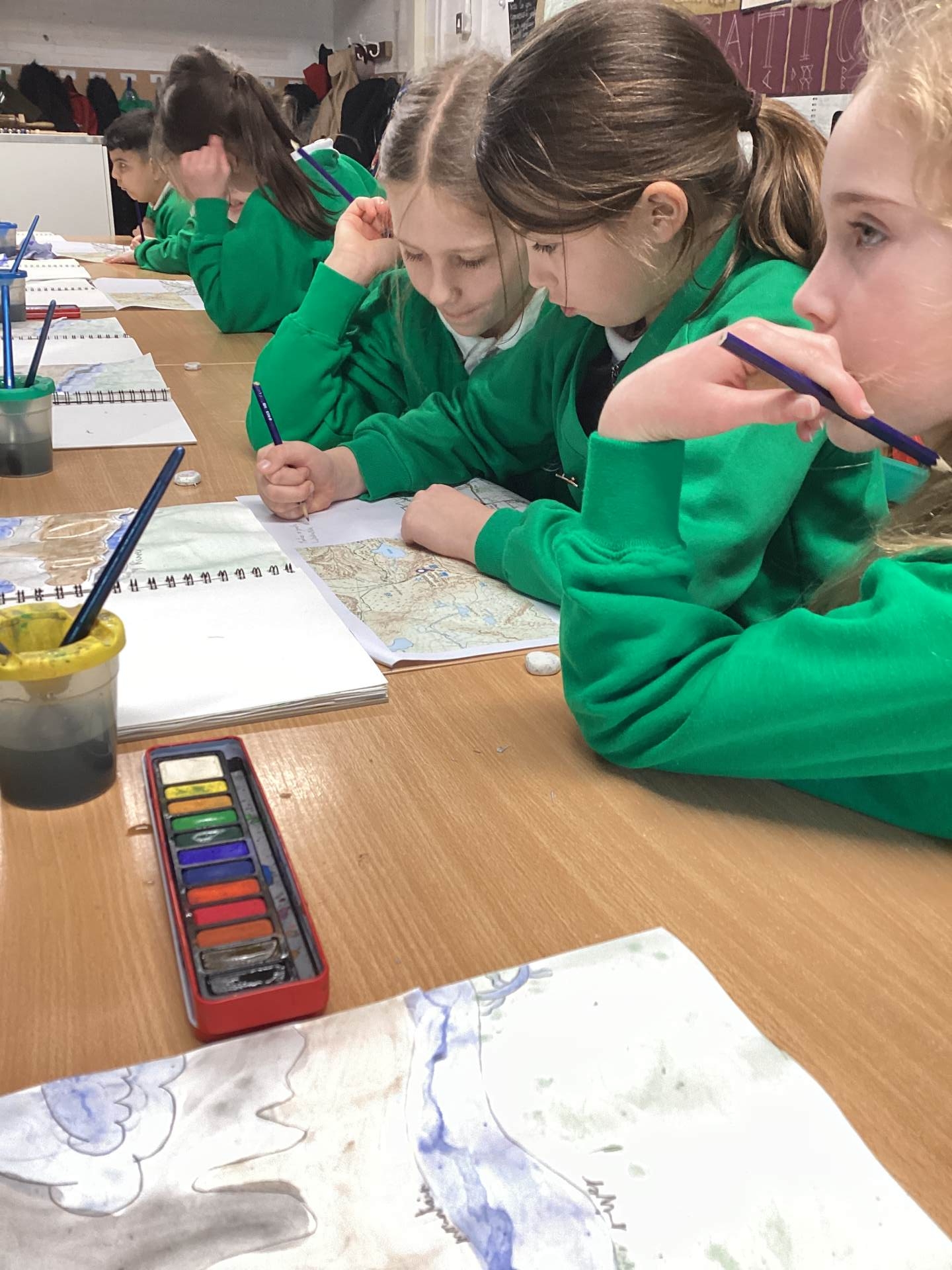 In geography we've explored different snapshots of Ordnance Survey maps to spot features of rivers and mountains using the keys, before asking questions and thinking about what we'd like to know.
