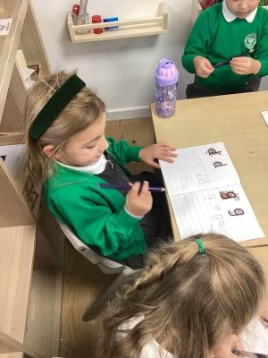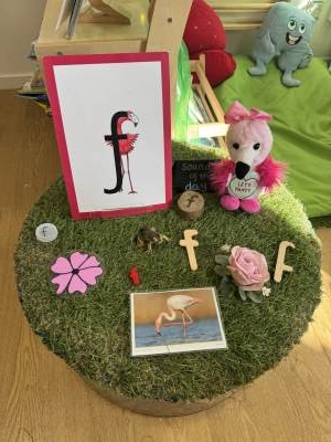 During our child initiated sessions we had a selection of activities linked to our new sounds, these included: writing h in hot dogs, using tweezers to move loose parts into the formation of a b, practicing writing the letter f in trays of dried flowers, using 'spy pens' to find the letter 'l'.