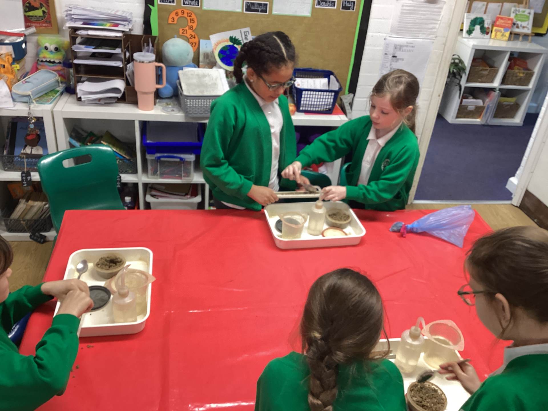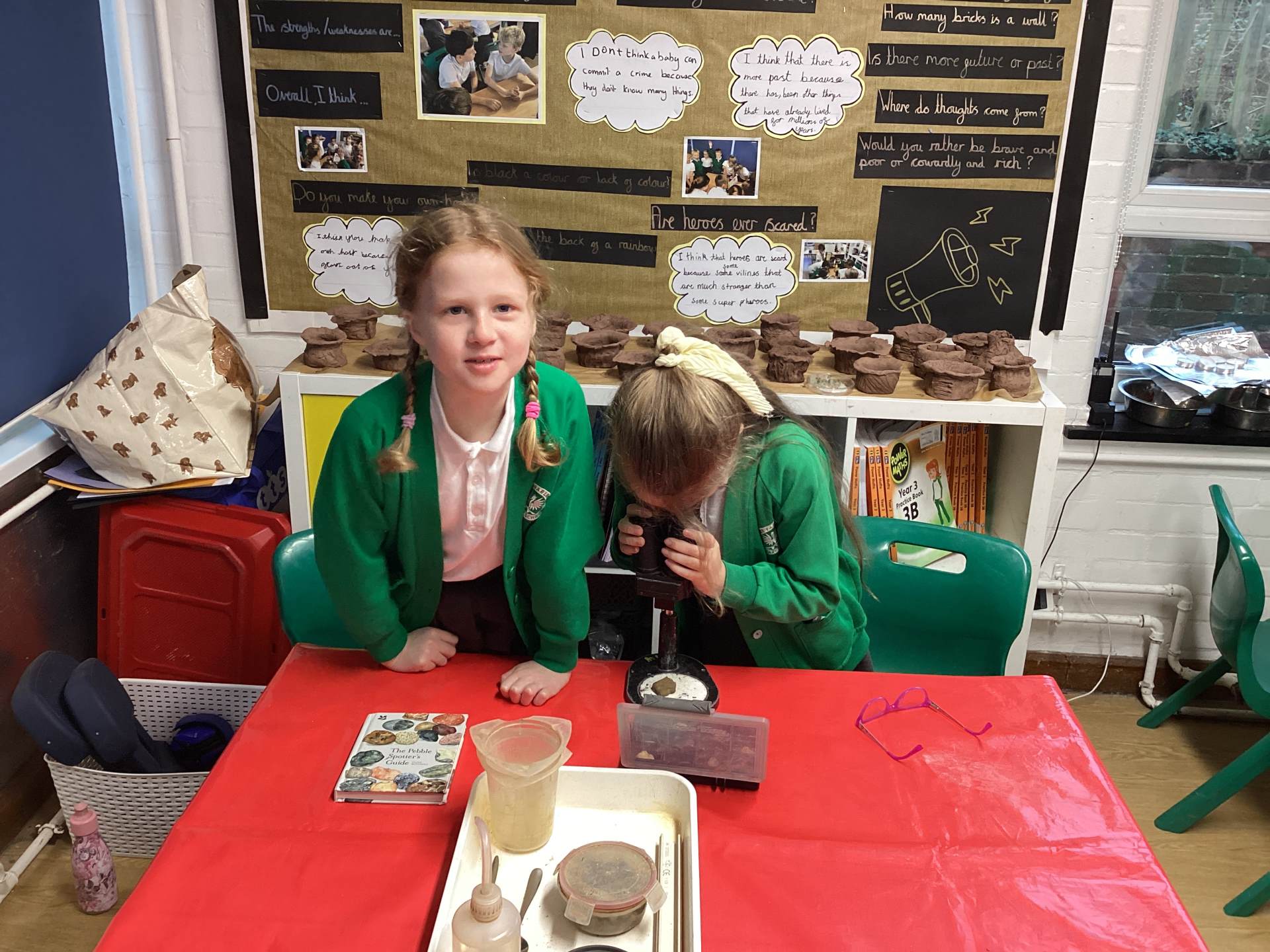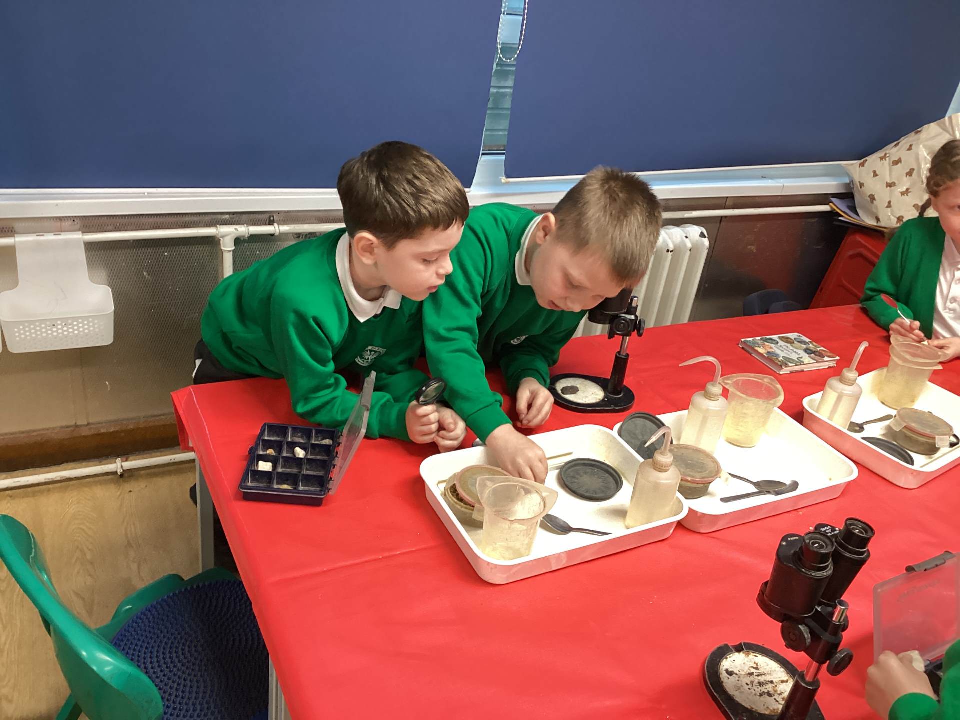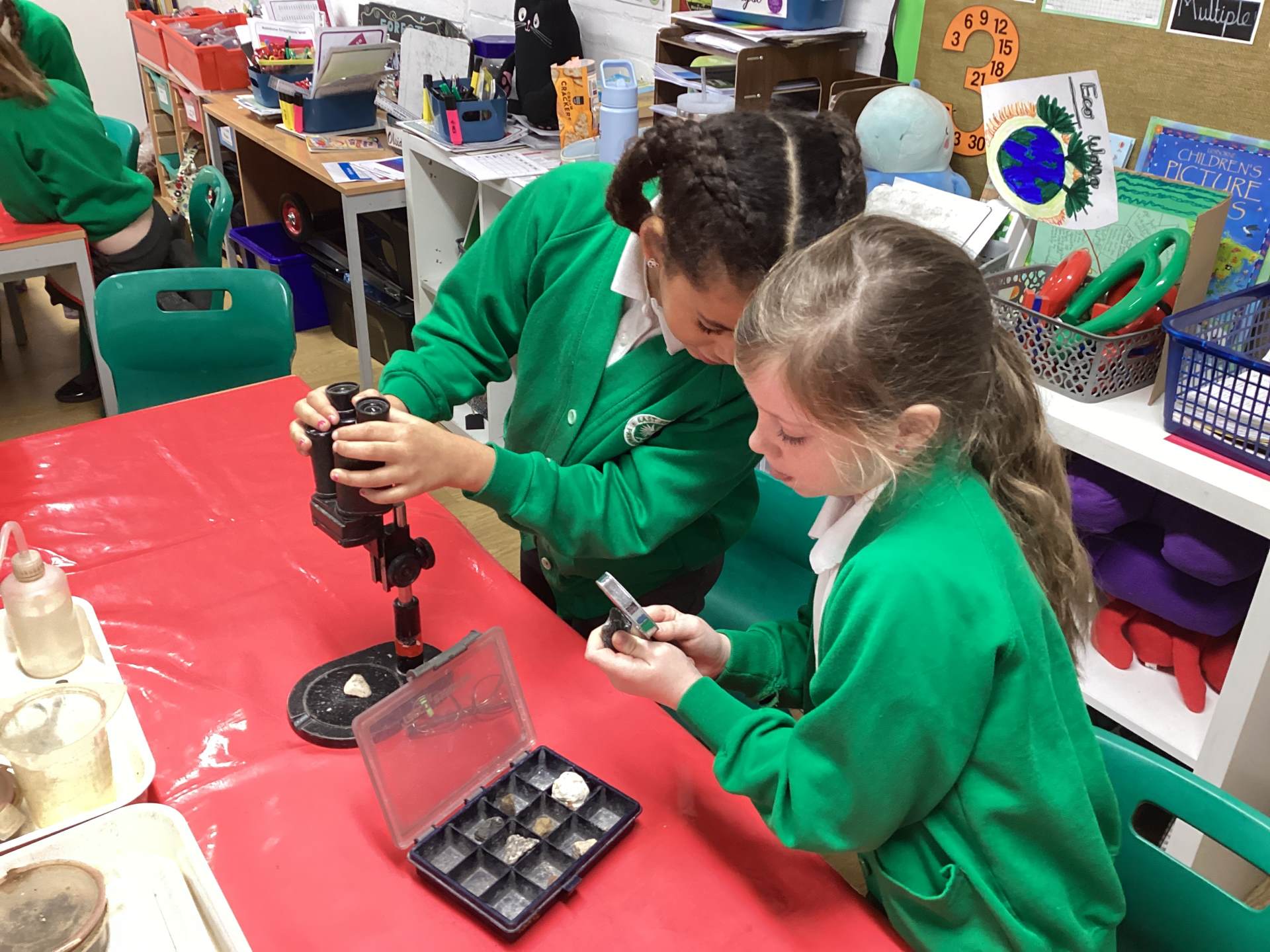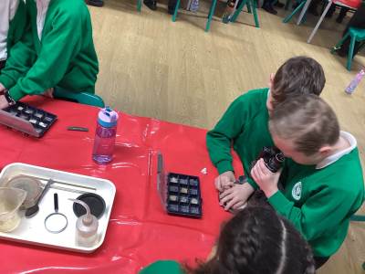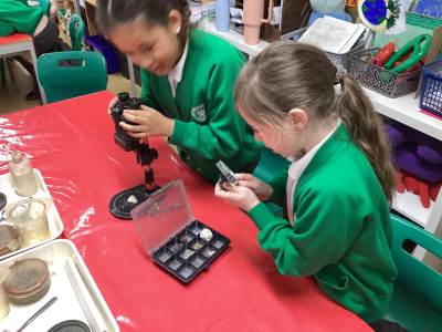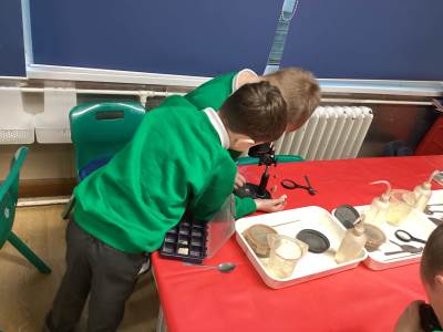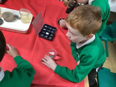 We started the day looking at a variety of rocks under a microscope and noticing that some had crystals in them, some had layers and some were powdery. We had to think about some of the different properties of rock, such as permeability, hardness and appearance. We categorised these based on their different properties and we learned the names for some of these fantastic rocks.