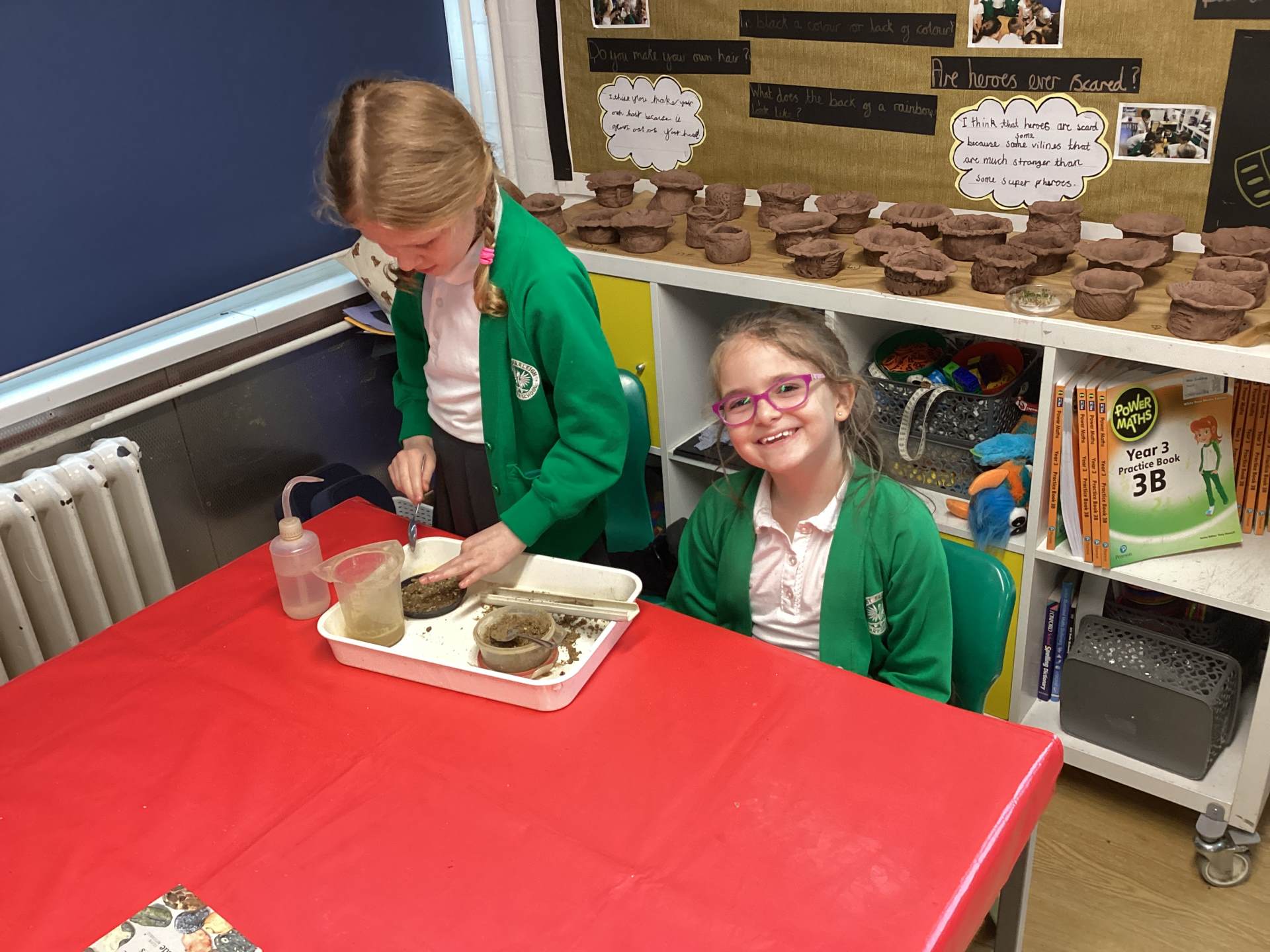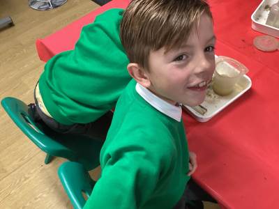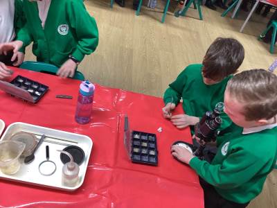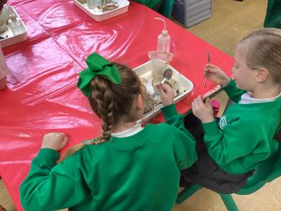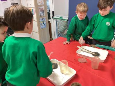 We experimented with making sedimentary rock with layers of sediment and water, building it up over time. We talked about how igneous rocks are made when lava from a volcano cools, and how metamorphic rocks are made when heat and pressure act on other rocks. We even had a go at making our own 'metamorphic rocks' using wax, turning our white wax 'rocks' into a weird-looking, flat, green, metamorphic rock - wow!