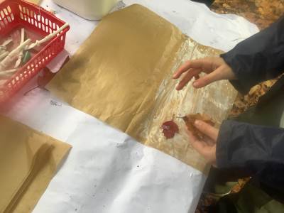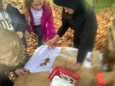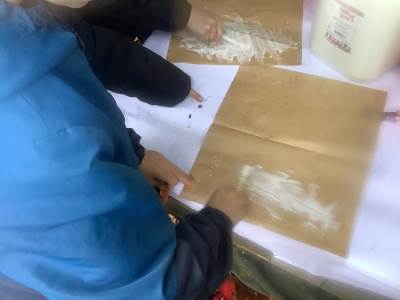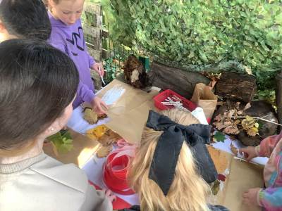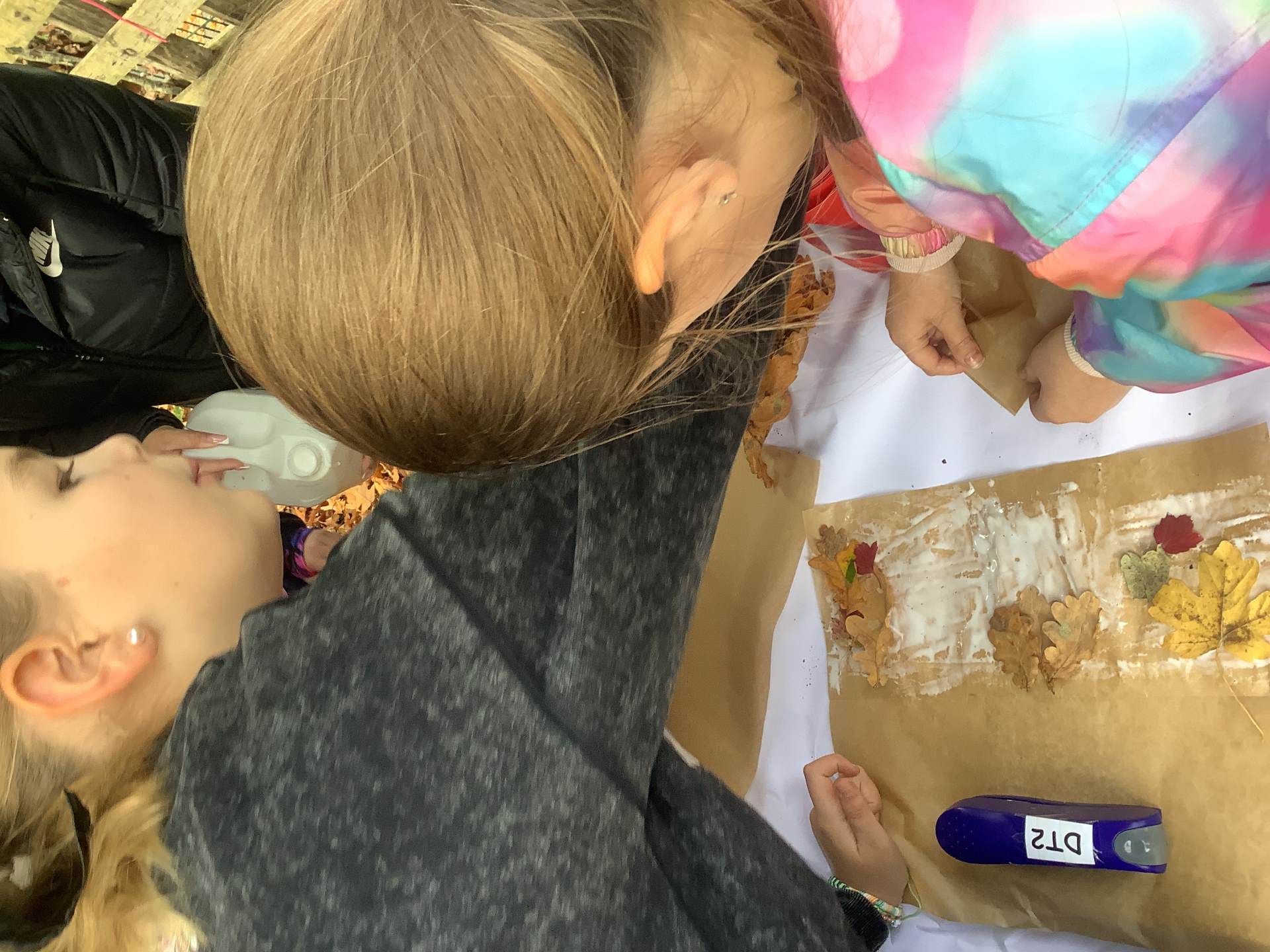 We used wax paper, card and leaves. We have thousands of leaves on the floor at the moment from all the trees in the school grounds.
