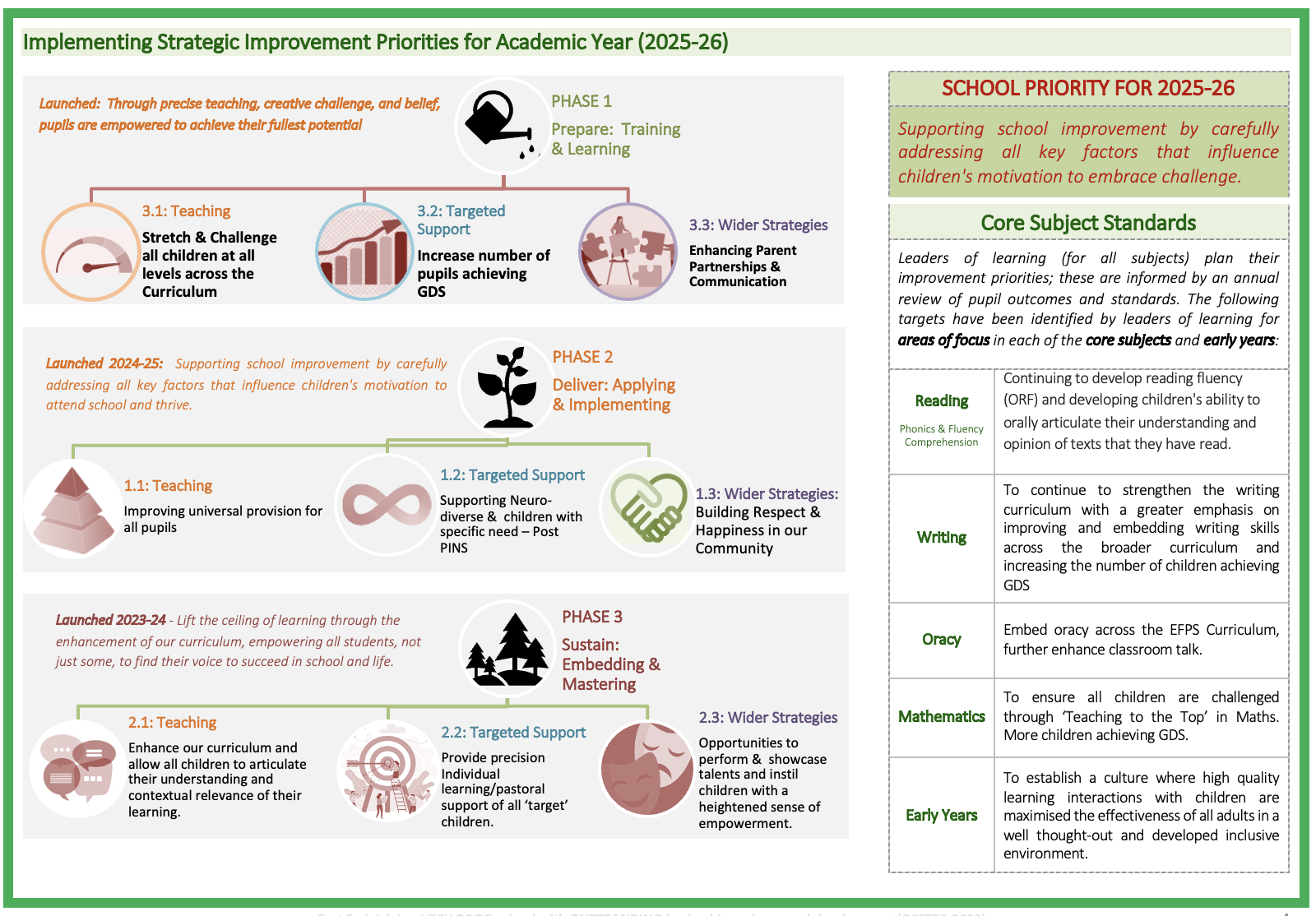 Each academic year, the staff and Governors are led by the Headteacher through a process of self-evaluation (linked to ‘explore’ – EEF). The agreed and shared principles for writing the Strategic Improvement Plan at our school are: